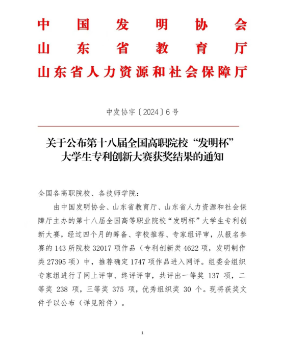 近日,由中国发明协会、山东省教育厅、山东省人力资源和社会保障厅主办的第十八届全国高等职业院校“发明杯”老员工专利创新大赛获奖结果公布。